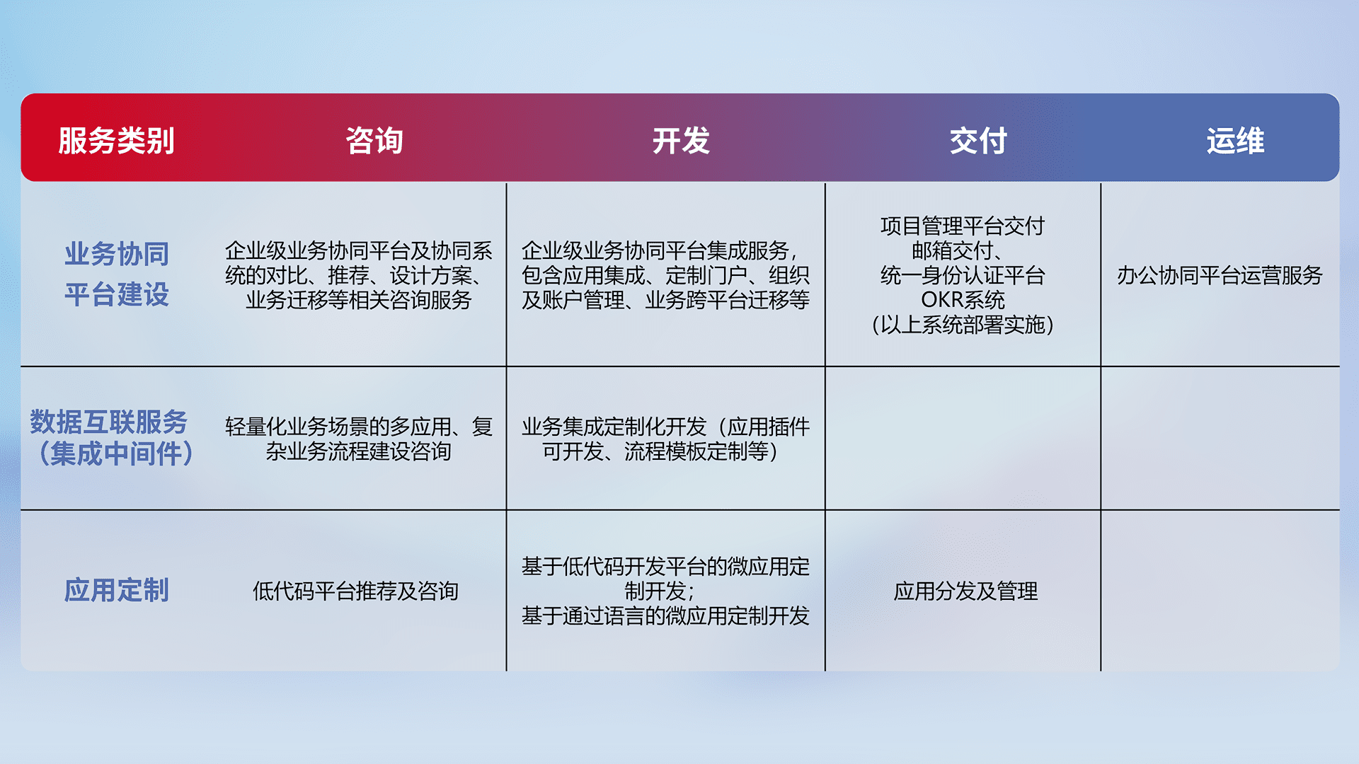 针对钉钉、、、企微、、IDaas等平台级产品提供产品的规划、、、方案、、、交付、、、定制化开发等服务,,,,实现如统一协同办公、、智能客户服务、、、、混合会议管理、、智能数据查询、、、等业务场景,,,,实现数字化转型。。。