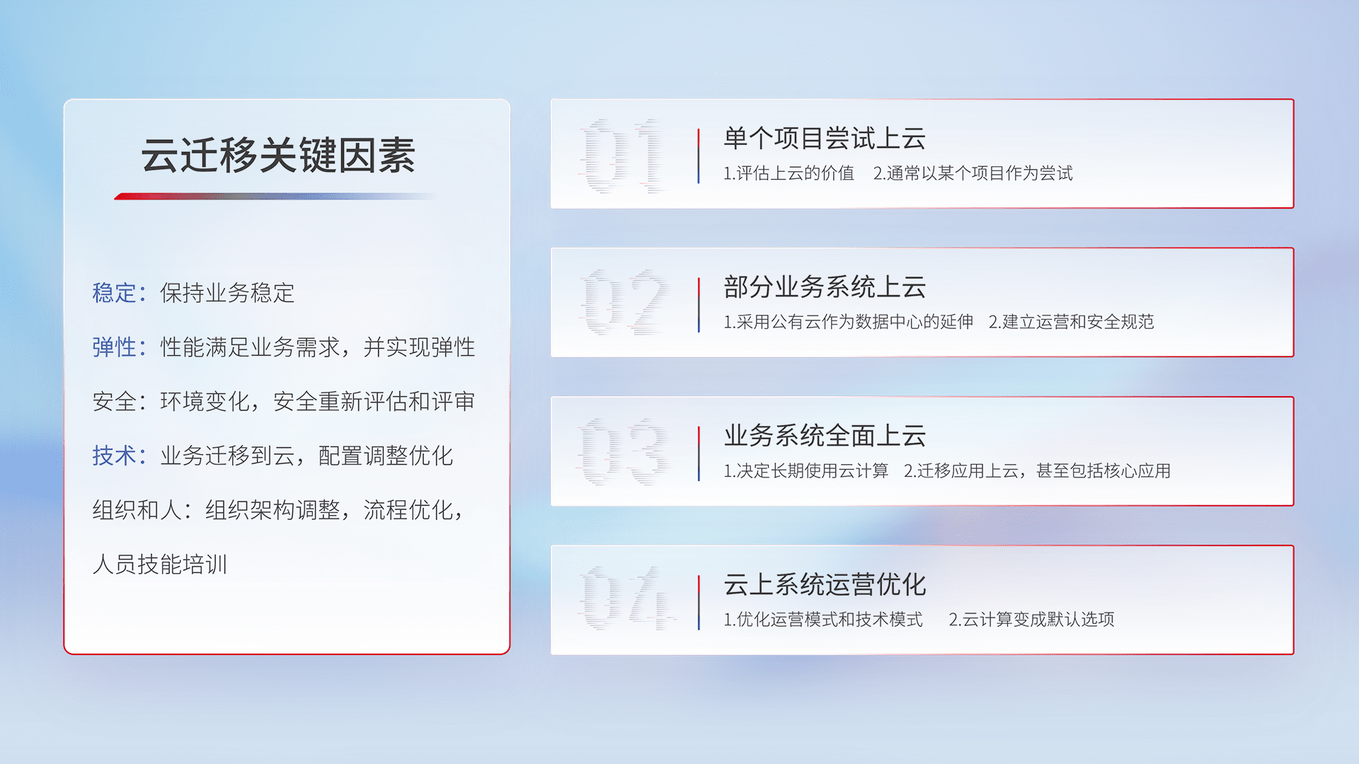 结合实际业务,,从规划设计、、云平台选型、、、云原生改造、、、、数据迁移、、集成交付,,,迁移全过程为客户识别最佳上云路径,,,,做好风险识别管理,,设计网络架构、、、、身份权限、、安全审计合规、、、、操作审计、、日志审计、、、、监控告警策略、、多站点容灾设计等,,对云上基础设施进行整体规划,,,提升IT治理水平,,以满足弹性、、高可用、、、高性能的需求。。。