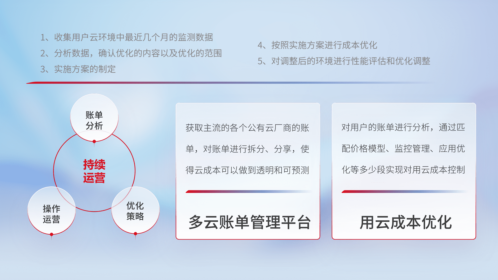 通过多云纳管,,,,以统一的资源数据模型把客户的云资源进行抽象和封装,,进而实现对多云资源的统一操作,,保障云资源管理的可靠性、、、稳定性与可用性。。量身定制化运维内容,,,,配置、、、、开发运维、、、、补丁管理、、、、备份、、、、监控、、、、认证和访问管理、、、审计和日常巡检等,,,,保障在用云过程中的可靠度,,稳定度以及高可用率。。。。